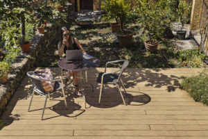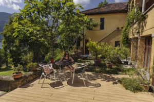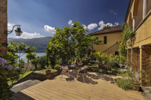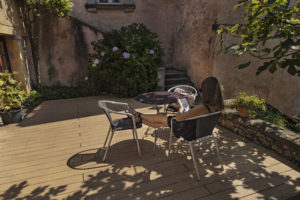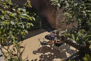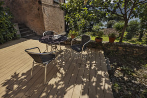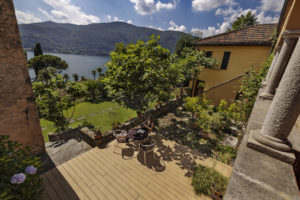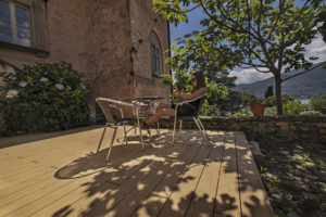 Sul Lago di Lugano, la terrazza di una villa storica a Morcote è stata riprogettata con il decking NatureLine di Naturinform in rovere marrone.